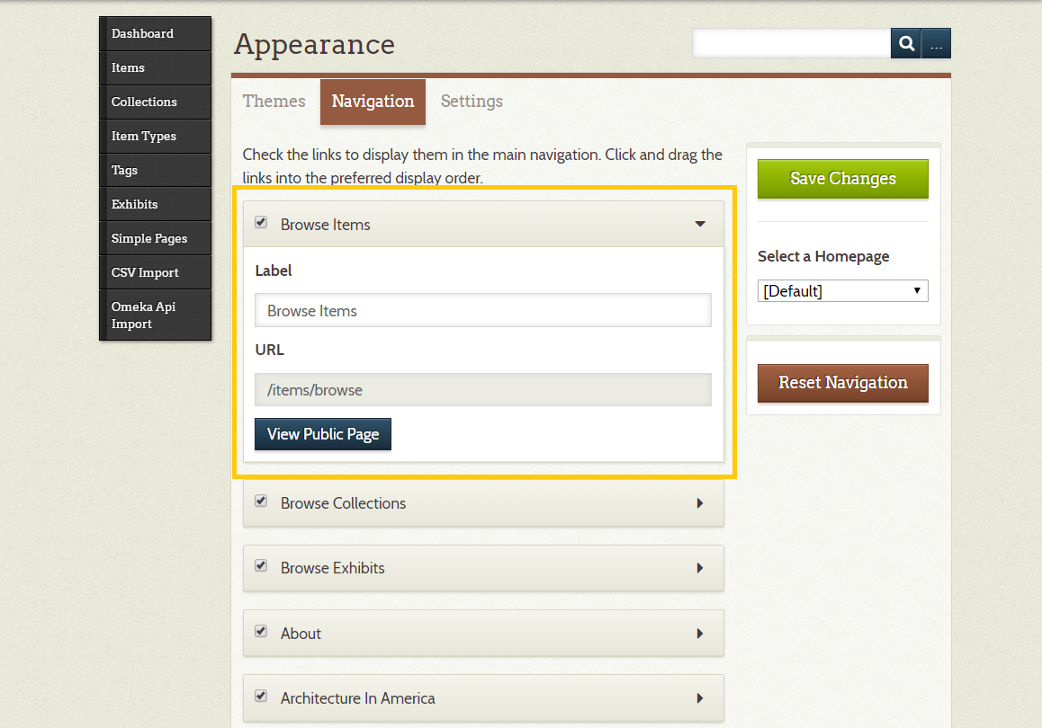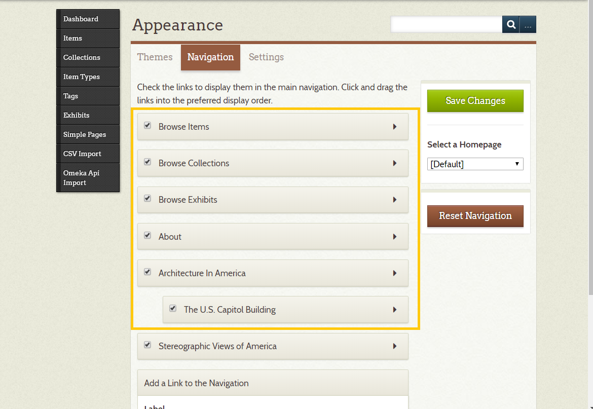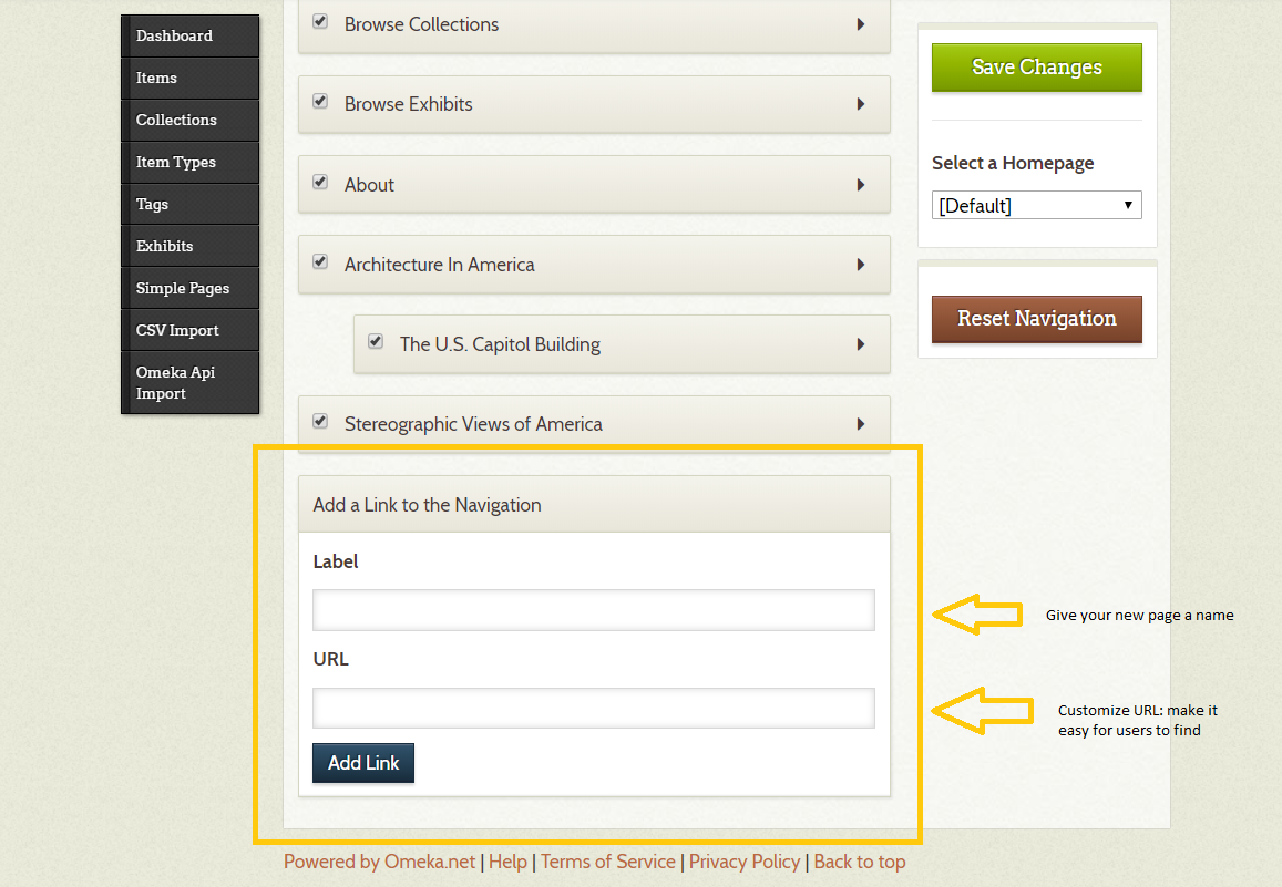 Don't like the way Omeka automatically organizes your site navigation? Change it to the one you want! Need to add more pages to cover information about your team or background on the project? Add more pages!
