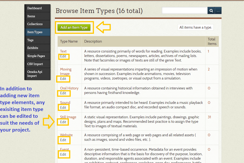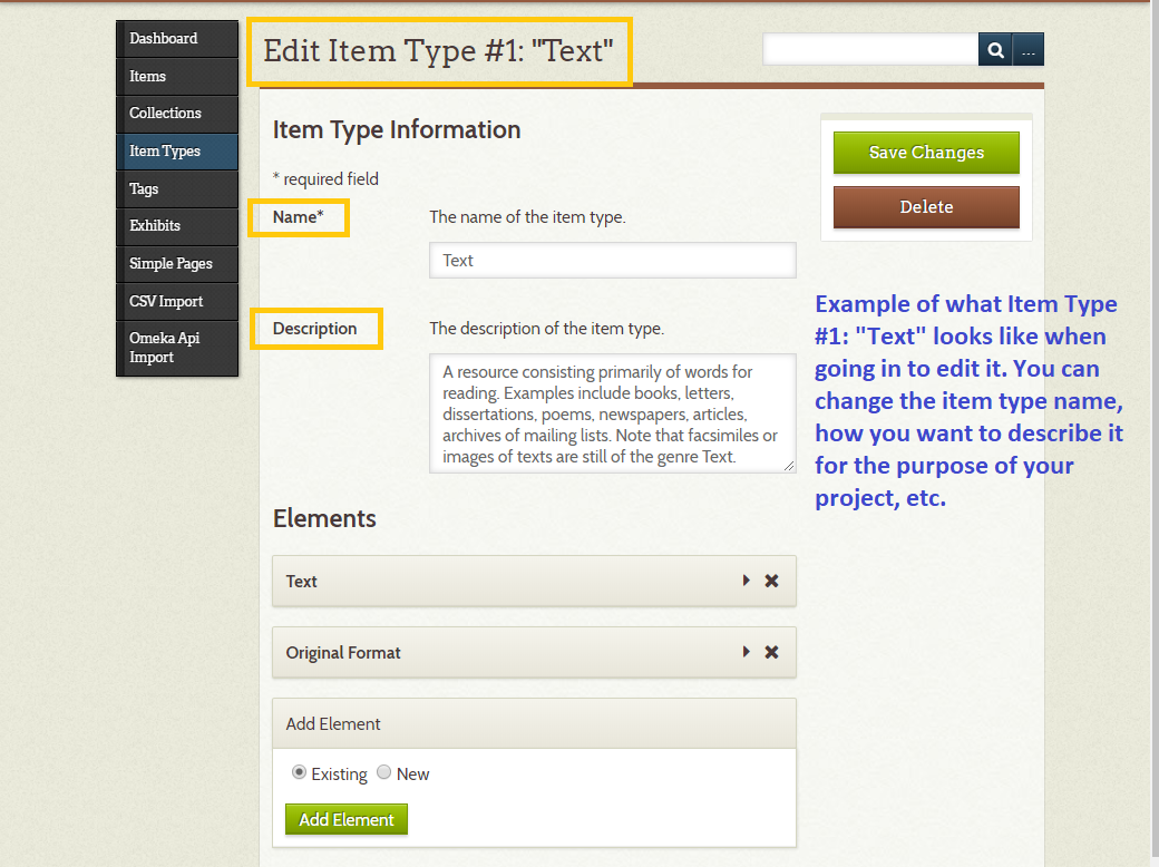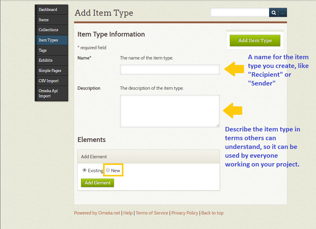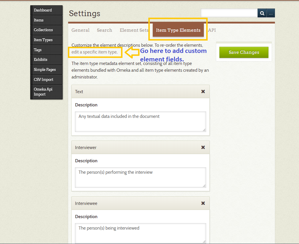 Item Type Elements are the metadata fields Omeka uses to help you describe the type of item you add to your site. These fields refer to if an item is text, video, still image, an email, etc. If there are element fields you need to add to the item type elements you can create them as needed.