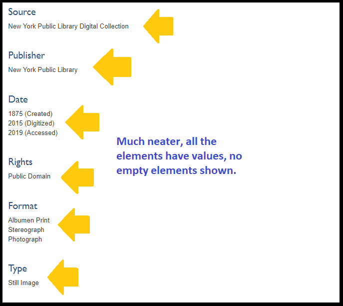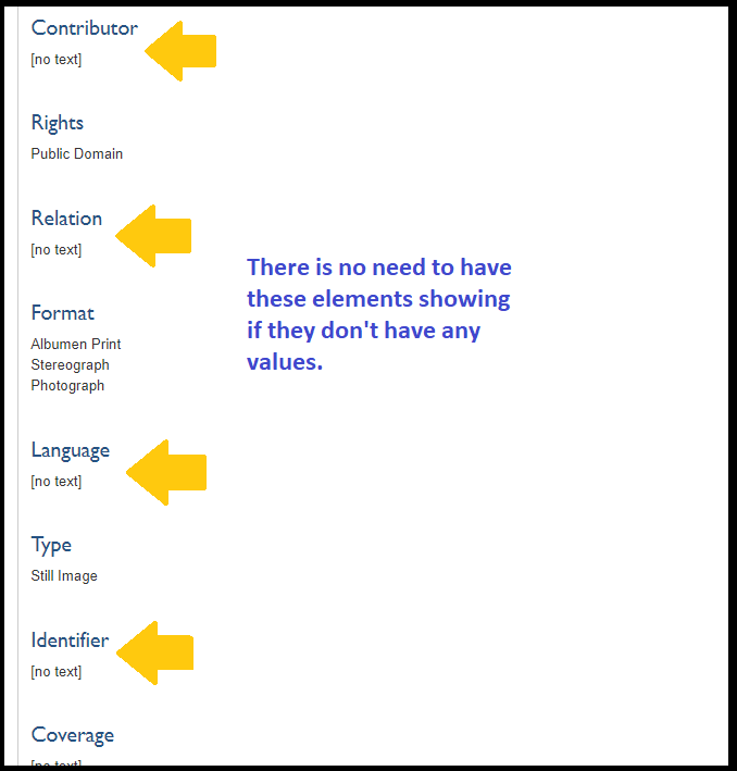 You will rarely use all of the Dublin Core metadata elements to describe the items in your collection. These empty elements will then be shown on your public Omeka page, which creates a messy look.