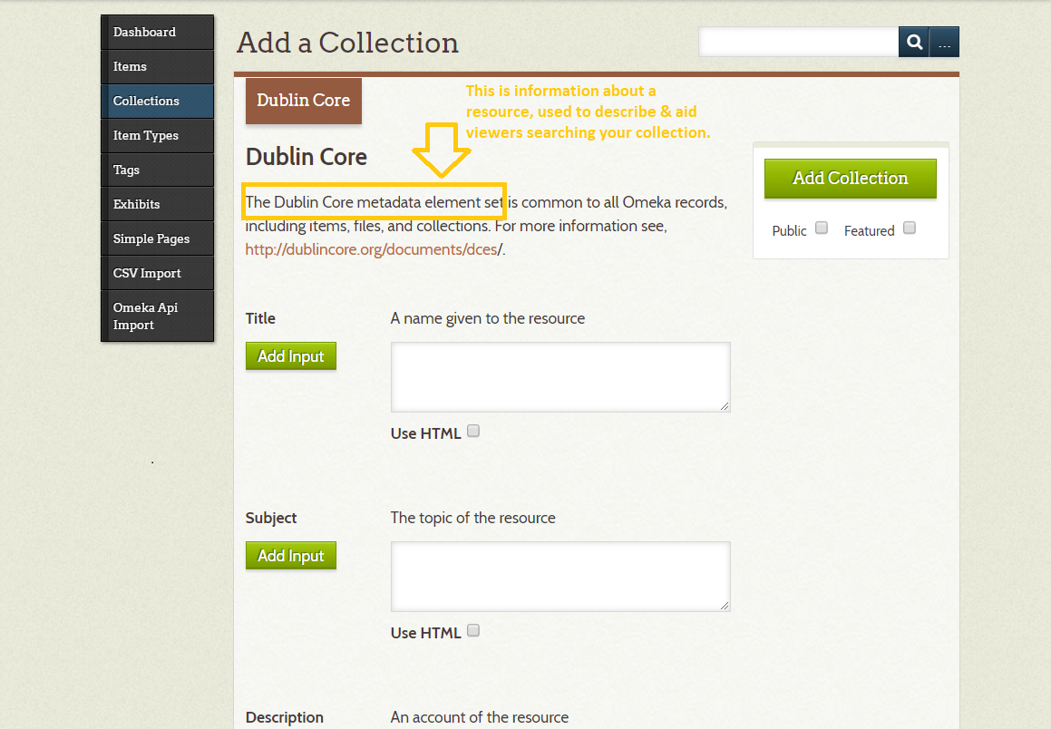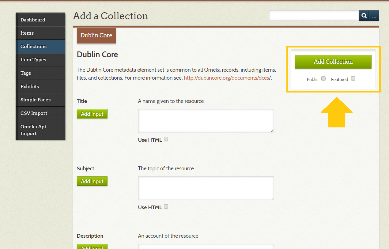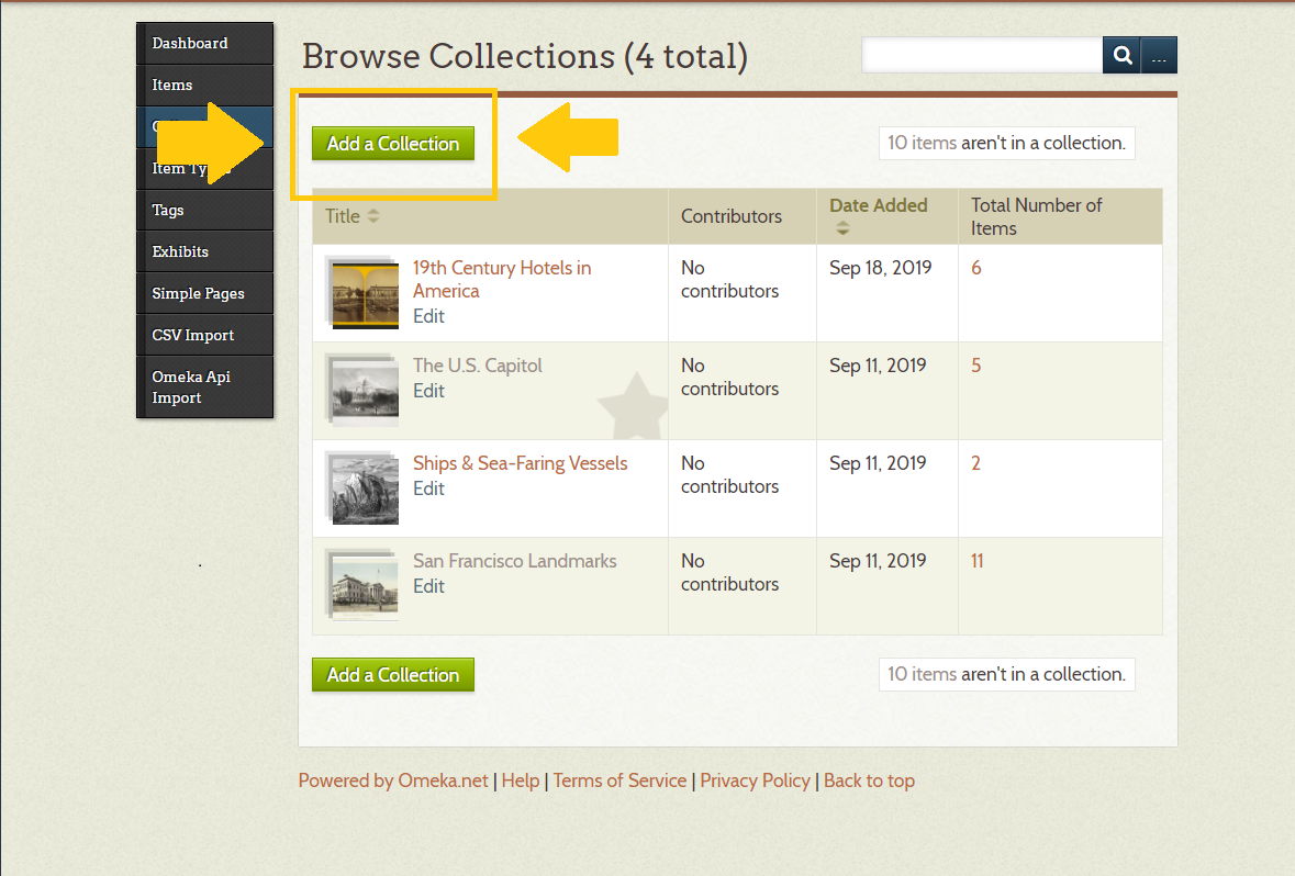 - Click the 'Add Collection' button on the right side of the page. Your collection is now Omeka Official!