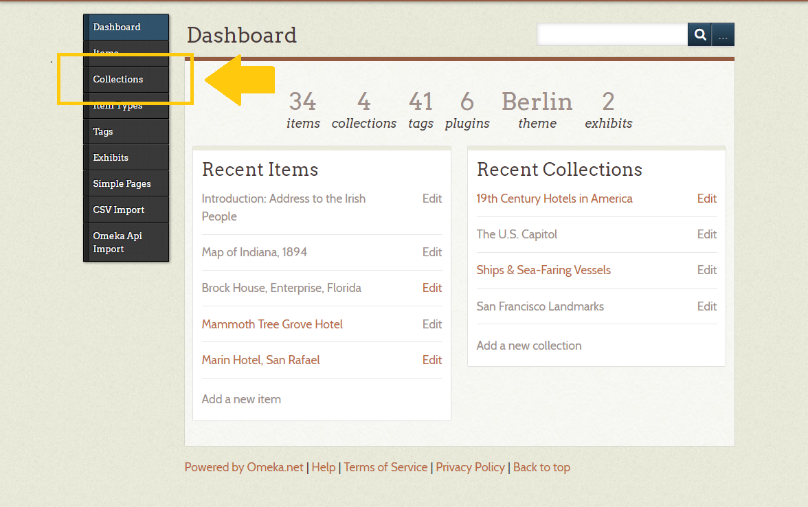 Creating a collection in Omeka is very easy. A collection is a way to organize the items you have added to Omeka, grouping items that go together in one place. It's one of the ways you can make it easier for visitors to your Omeka site to explore your content.