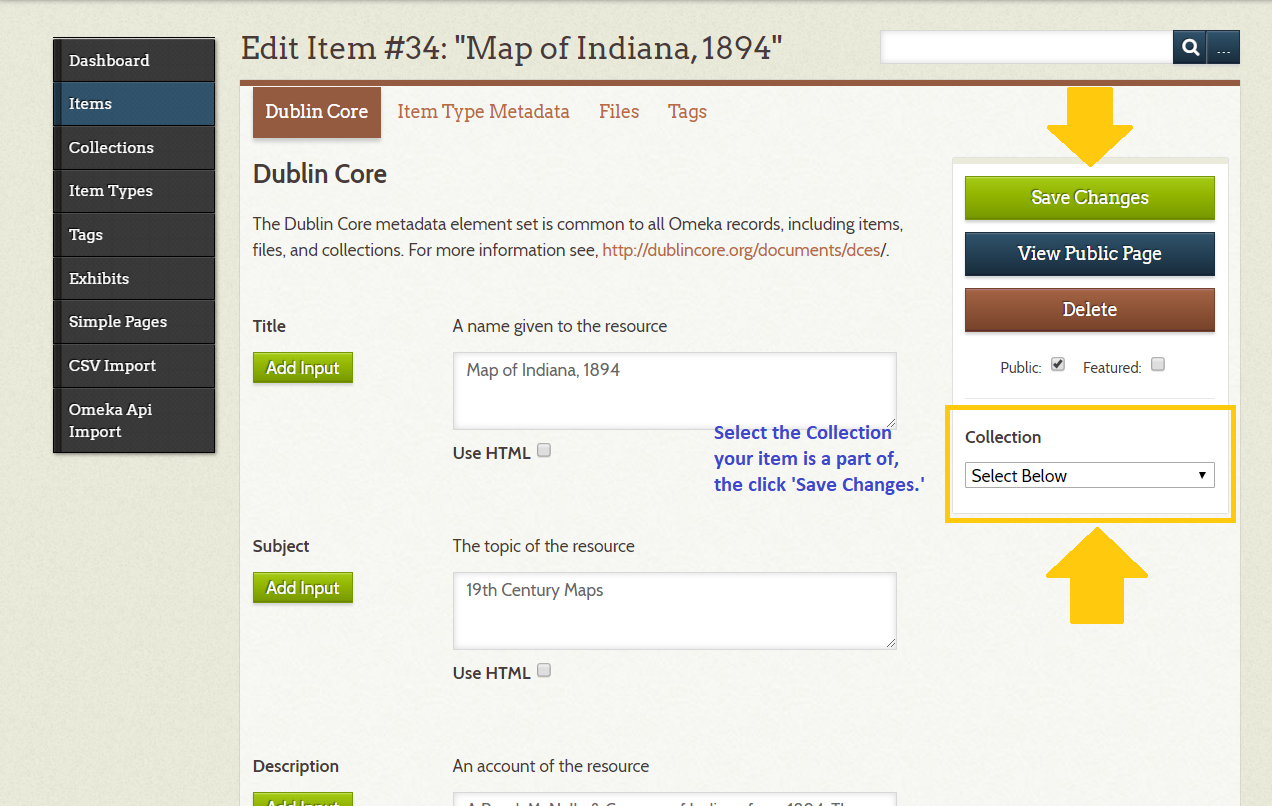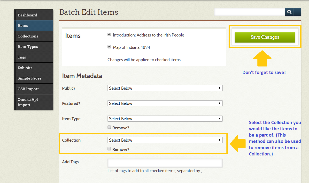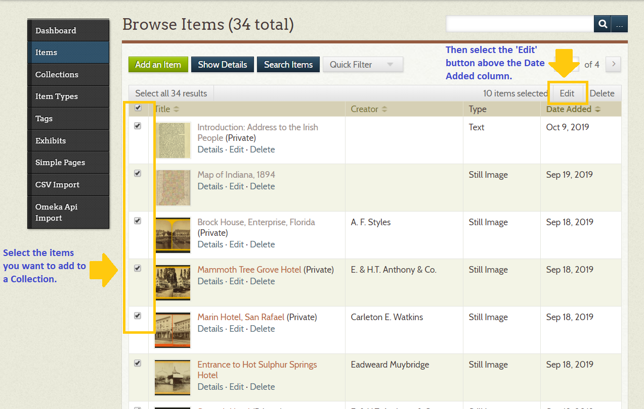 Items can be added to your Omeka collection in two different ways. Either you add each item individually to a collection, or you add multiple items to a collection in a batch. The first method is good if you are adding additional items to your collection, but it laborious and kind of a pain if you are adding many items to a collection. In that case the second method is much easier. You select which items you want to put in a collection and edit the metadata as a batch to add those items.
