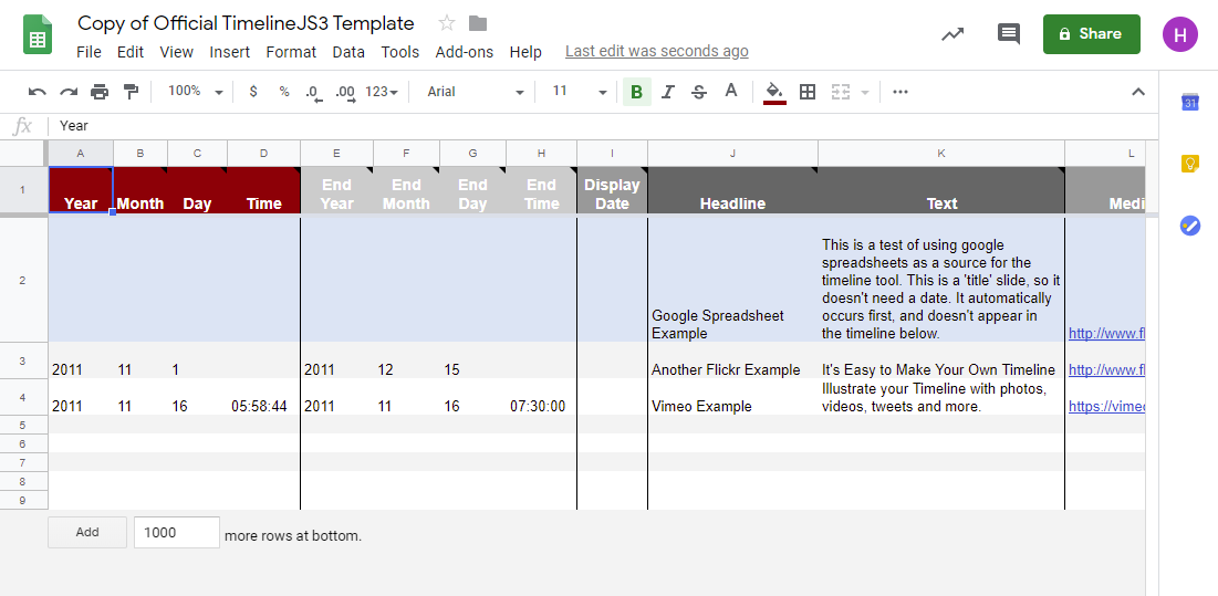 - Edit the template to include the dates, text, links, and media specific to your project. New rows can be added if needed, each row is a 'slide' in your timeline.