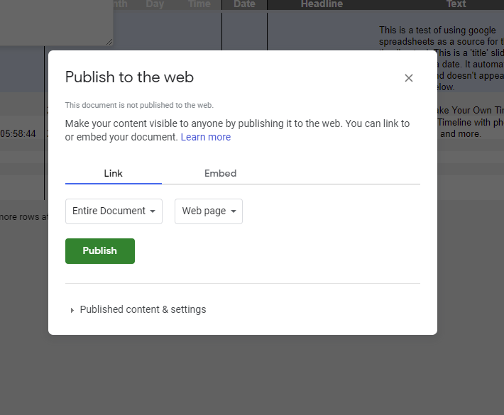 - Publish your timeline to the web: under the File menu, select 'Publish to the Web', then copy the URL from the top of the page.