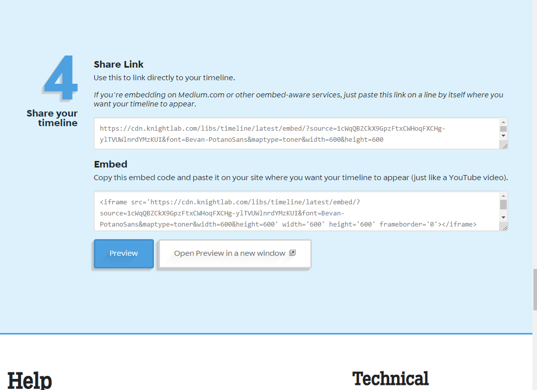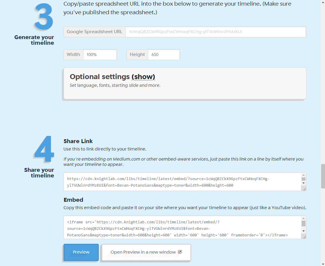 - Generate your timeline: go to the Timeline JS site, enter URL for spreadsheet, click Preview! (This is great fpr making changes to your spreadsheet, you can see them right away.)